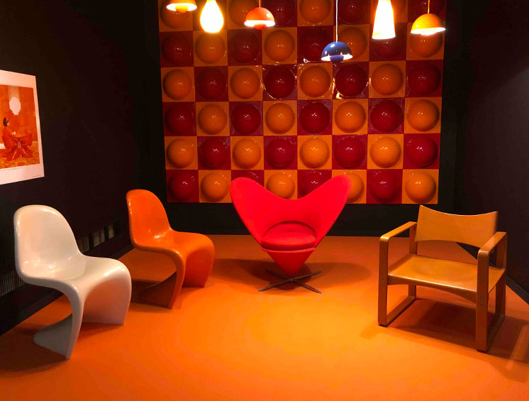 パントンは王立美術アカデミー建築学科→アーネ・ヤコプスン事務所という経歴の持ち主。下の空間コーディネートからもわかりますが、パントンは奇抜でワクワク興奮するようなデザインを多く残しています。(機能性に情感を漂わせたデザインが主流の当時は残念ながら受け入れらなかったようです…) 今回の撮影OKスポット↓