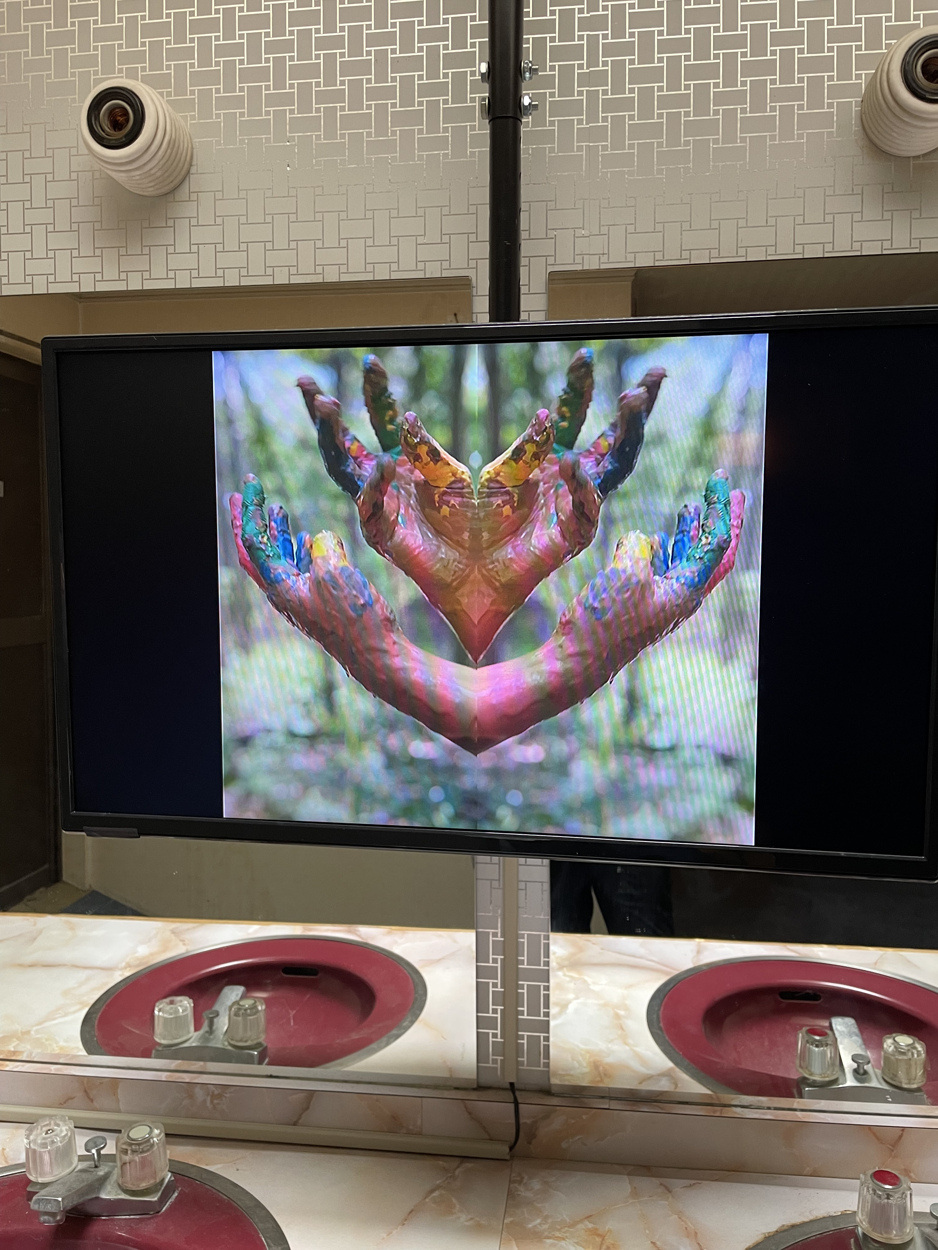 アジアのアーティストやキュレーターらの専門家ネットワーク、プロダクション・ゾミア。6名のアジア人アーティストによる映像作品が展示されていました。一つ一つ見たかったのですが、10分前後ある作品は子連れには厳しく、サッと見しかできませんでした。 中でも、メッチ・チューレイ&メッチ・スレイラスというカンボジアの姉妹アーティストの作品は、手を使った不思議な作品で印象的でした。