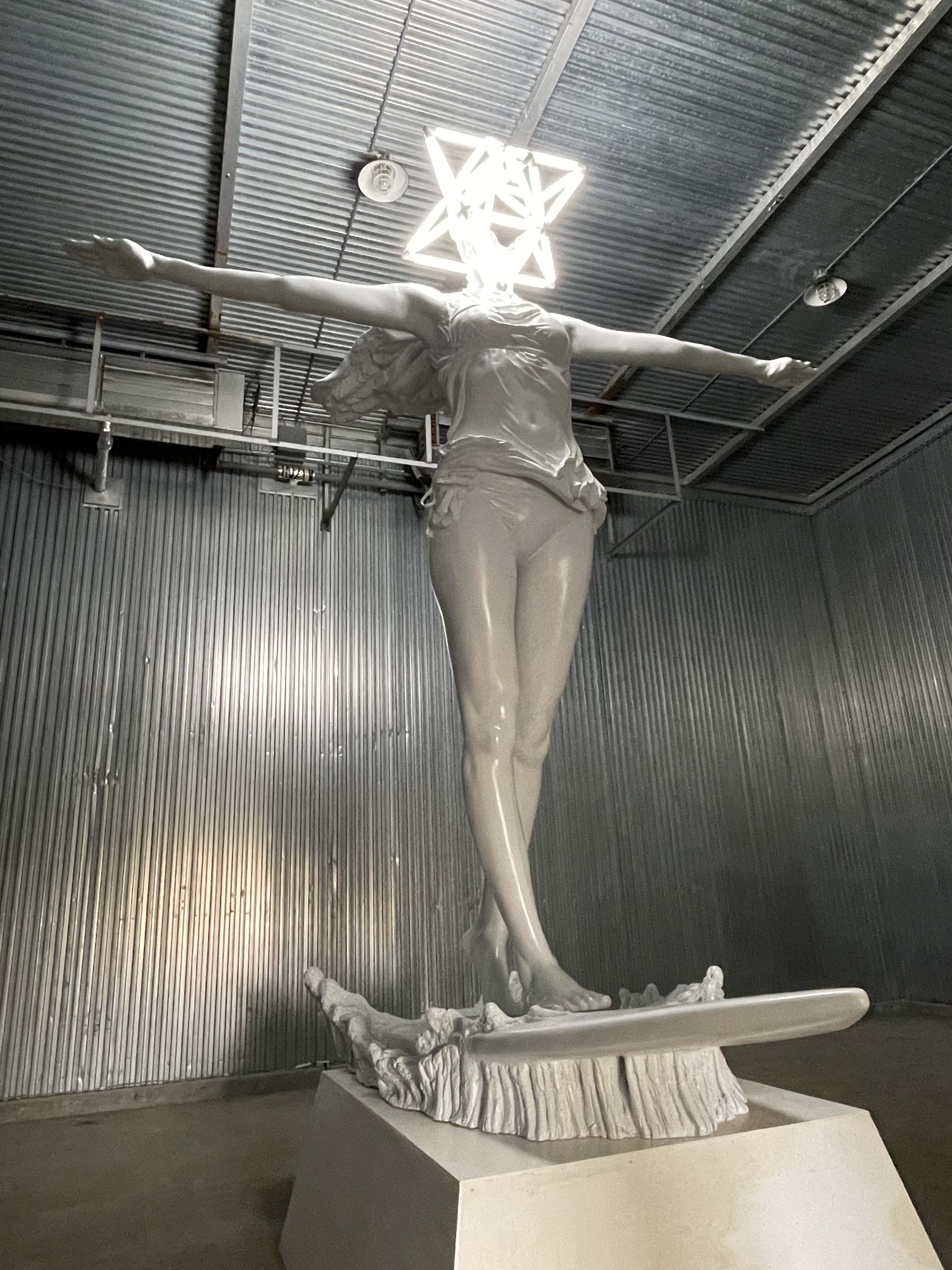 今回のキービジュアルにもなっている作品です。キービジュアルの背景が水色なので、てっきり外にあって青空の下サーフィンに乗り出す像だと勘違いしていました。実際の設置は旧水産化工場で、エンジェルが閉じ込められてしまっているよう。外で見たかったかな。 しかし、顔部分が蛍光灯だったので、屋外設置は難しいですね。