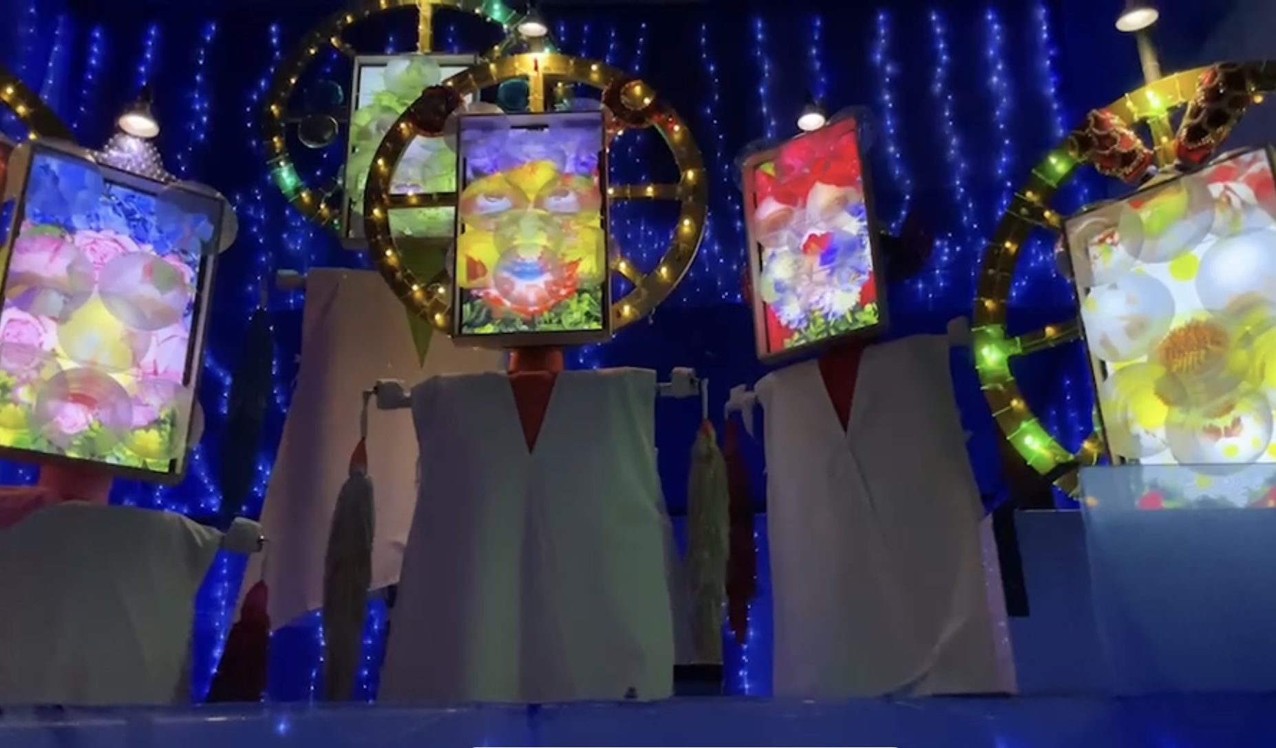 『手作りの人形、自身の顔や体のパーツを映した映像、自作の楽曲などを組み合わせた、独特の世界観のビデオ・インスタレーション』です。これはこどもが大喜び。巨大な人形の装置に液晶パネルがついており、パンジーに彩られた作者の顔が映し出されます。 液晶パネルの全面には歪みを発生させる透明レンズ、背後には派手な点灯ライトがついており、さながら遊園地のよう。 そして、独特のメロディーに乗って、不思議な歌詞の歌を6体?(うろ覚え)の巨大人形が動きながら、光りながら、歌います。 とっても怪しさ満点なのに、耳に残る。 この世界観と音楽を作ることができる作者のセンスに脱帽です。